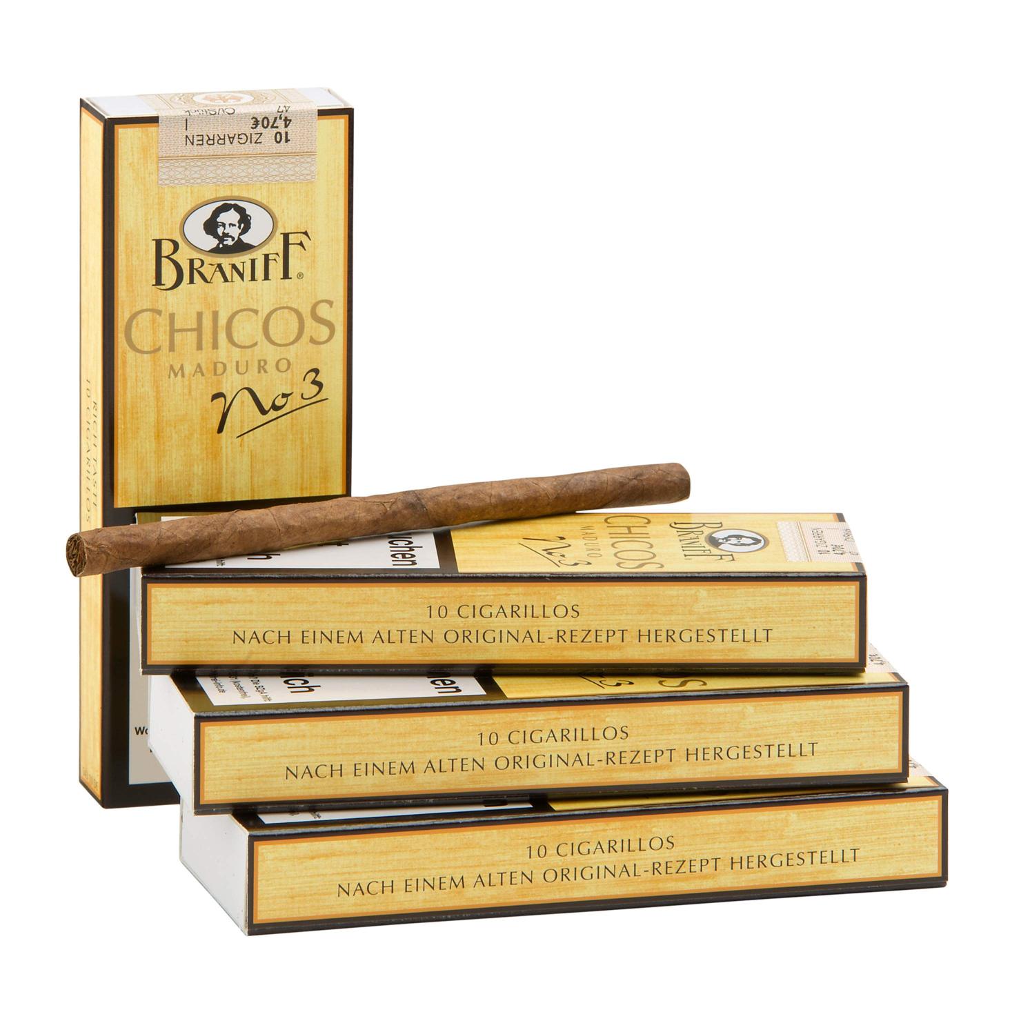 The BRANIFF CHICOS NO 3 provide magical moments with their elegant format. They have a high-grade, natural leaf wrapper and are perfect, delicately spicy cigarillos for occasional use.